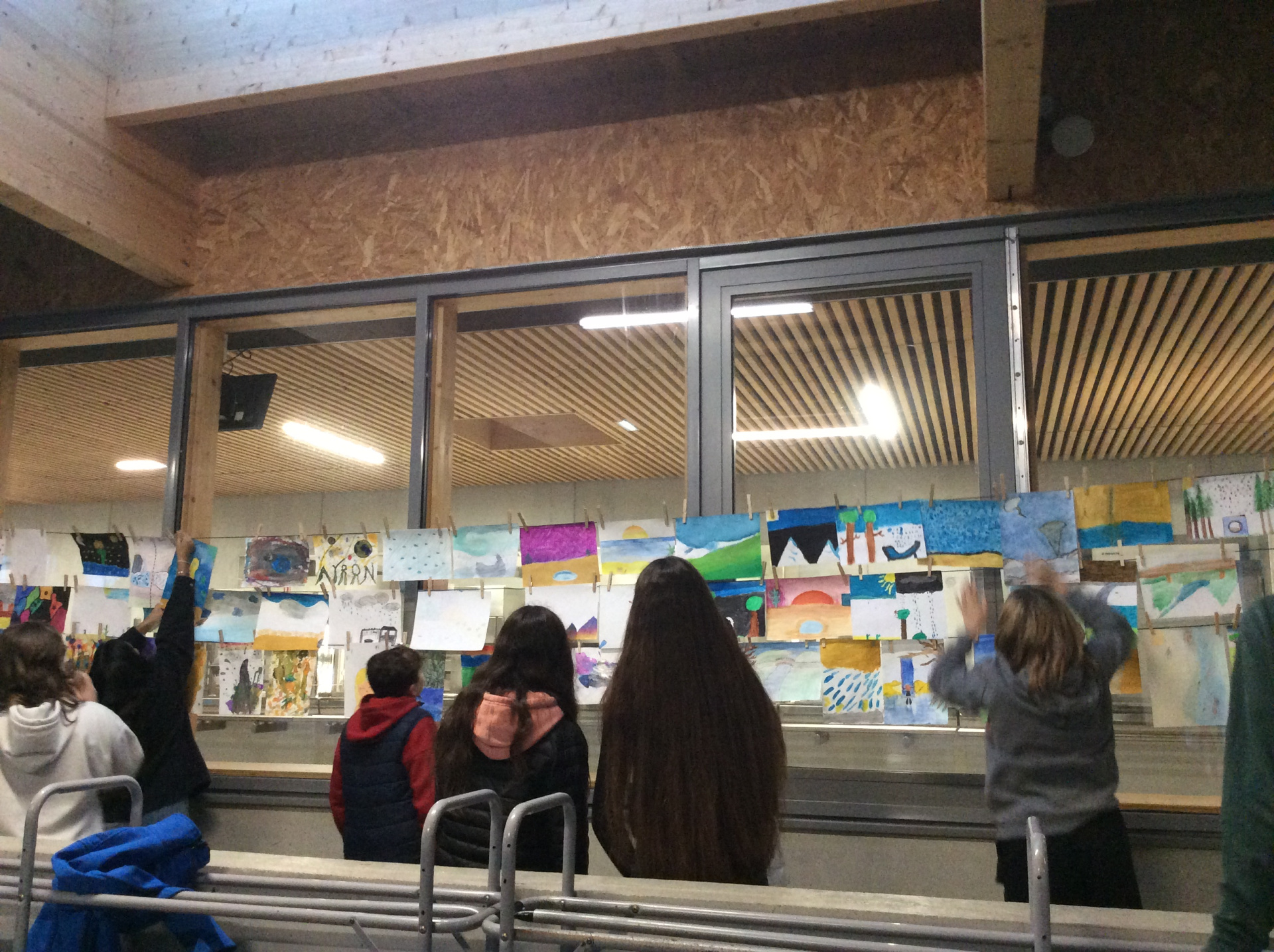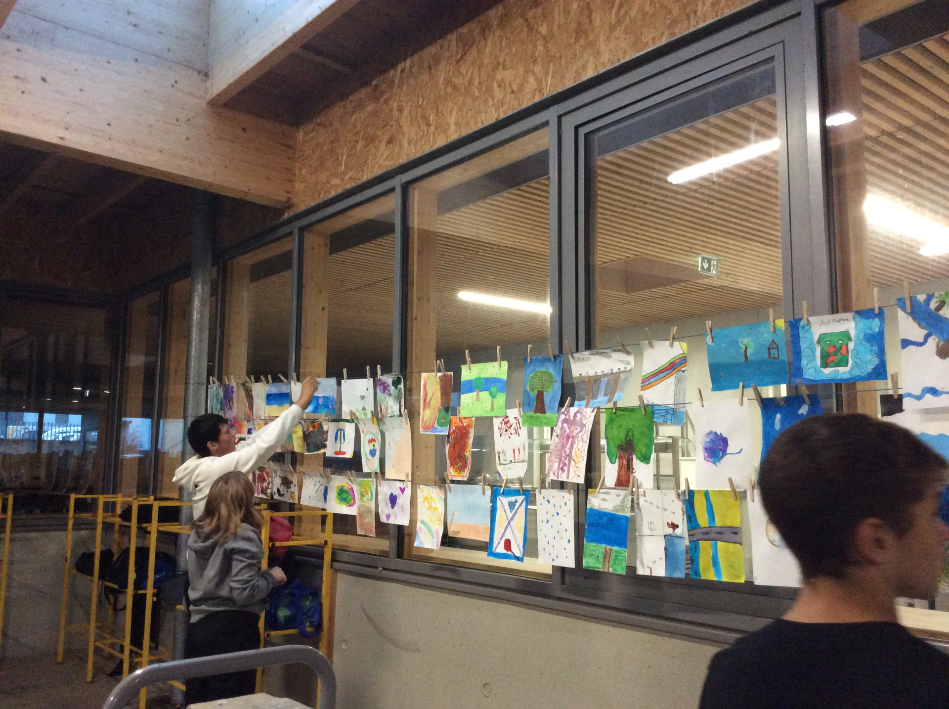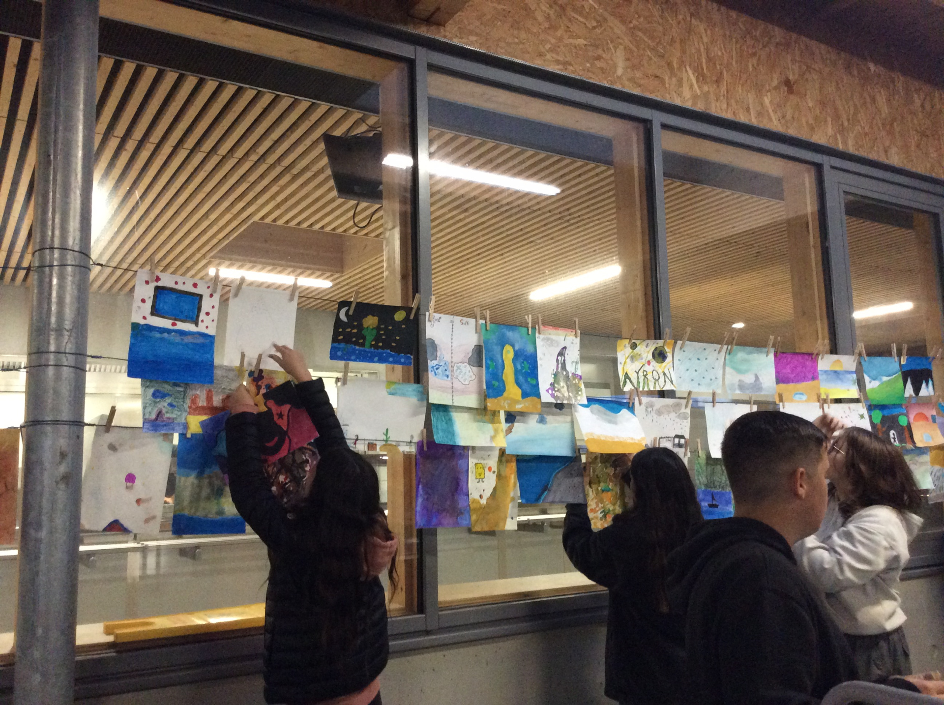 ’Les réalisations plastiques (dessins, peintures, photographies et autres images numériques, collages, poésies visuelles, etc.) conçues à partir d’une invitation commune, avant d’être suspendues à l’aide de pinces à linge à des fils tendus en extérieur, composent ainsi un temps créatif particulier au sein d’un projet apte à se prolonger. Et c’est le fait d’agir ensemble en coopérant qui fait œuvre. » (texte pris sur le site)