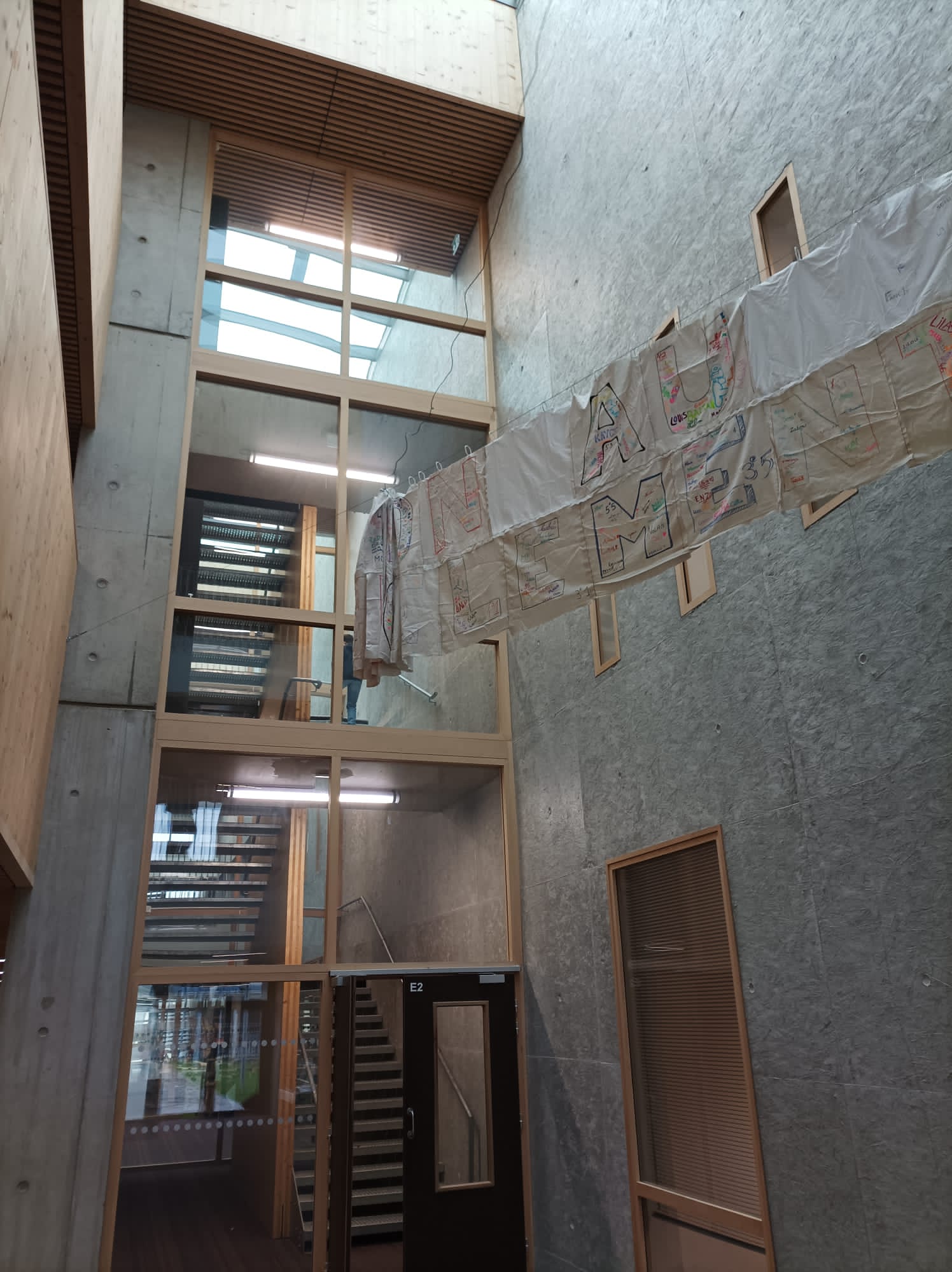 Ce puzzle collectif a ensuite été reconstitué et suspendu au dessus du hall d’entrée.