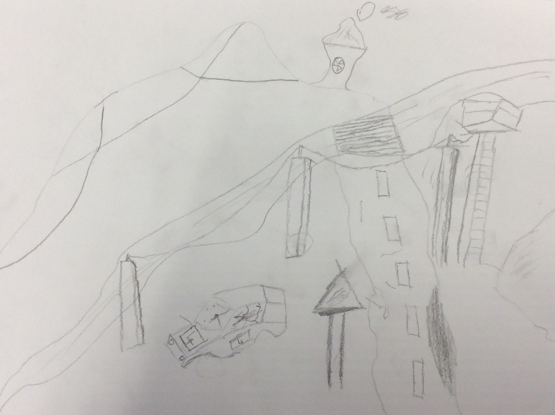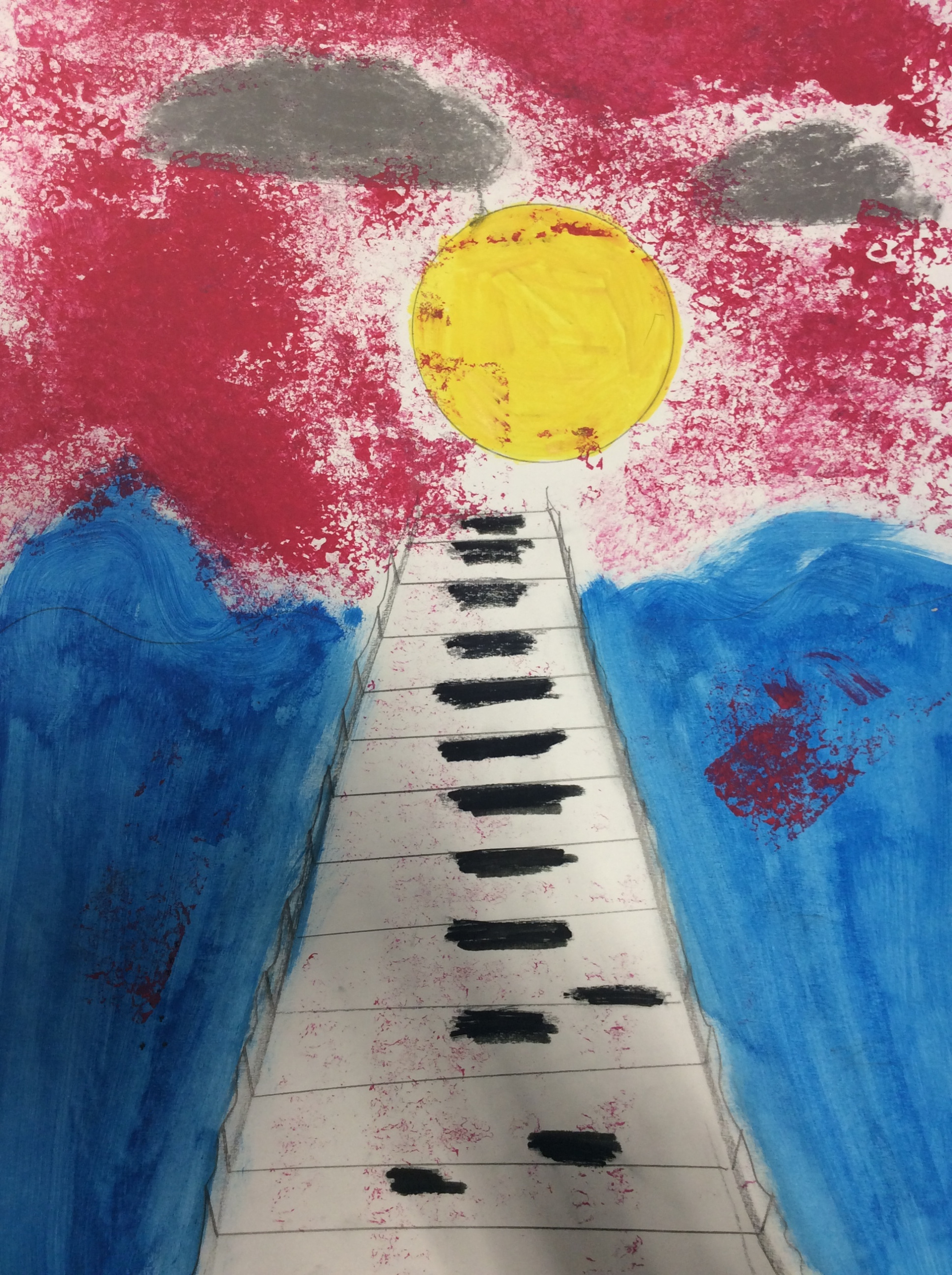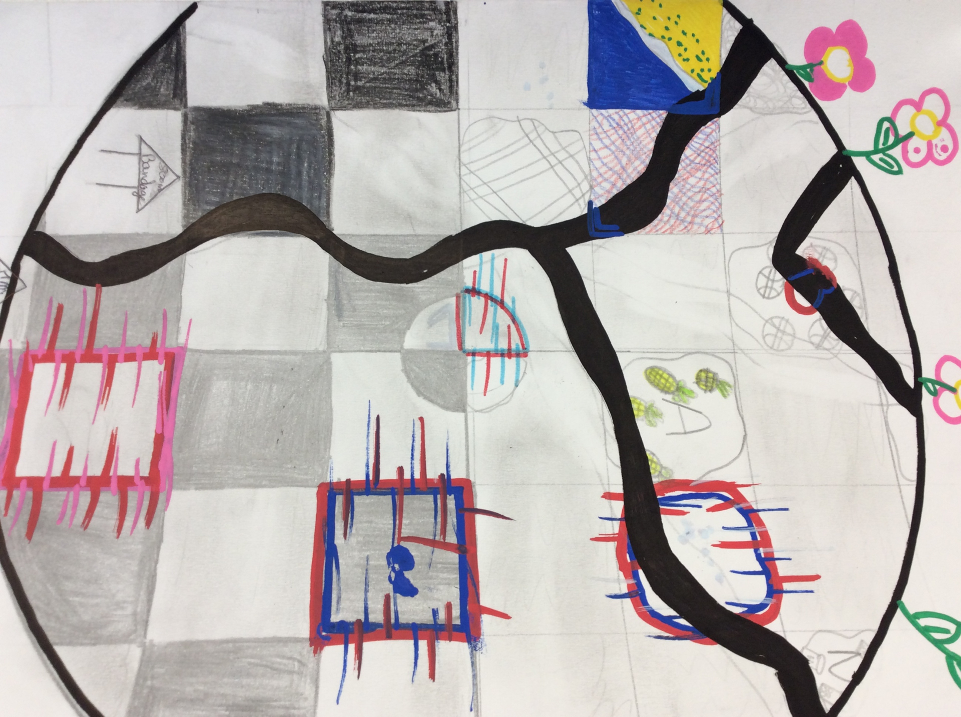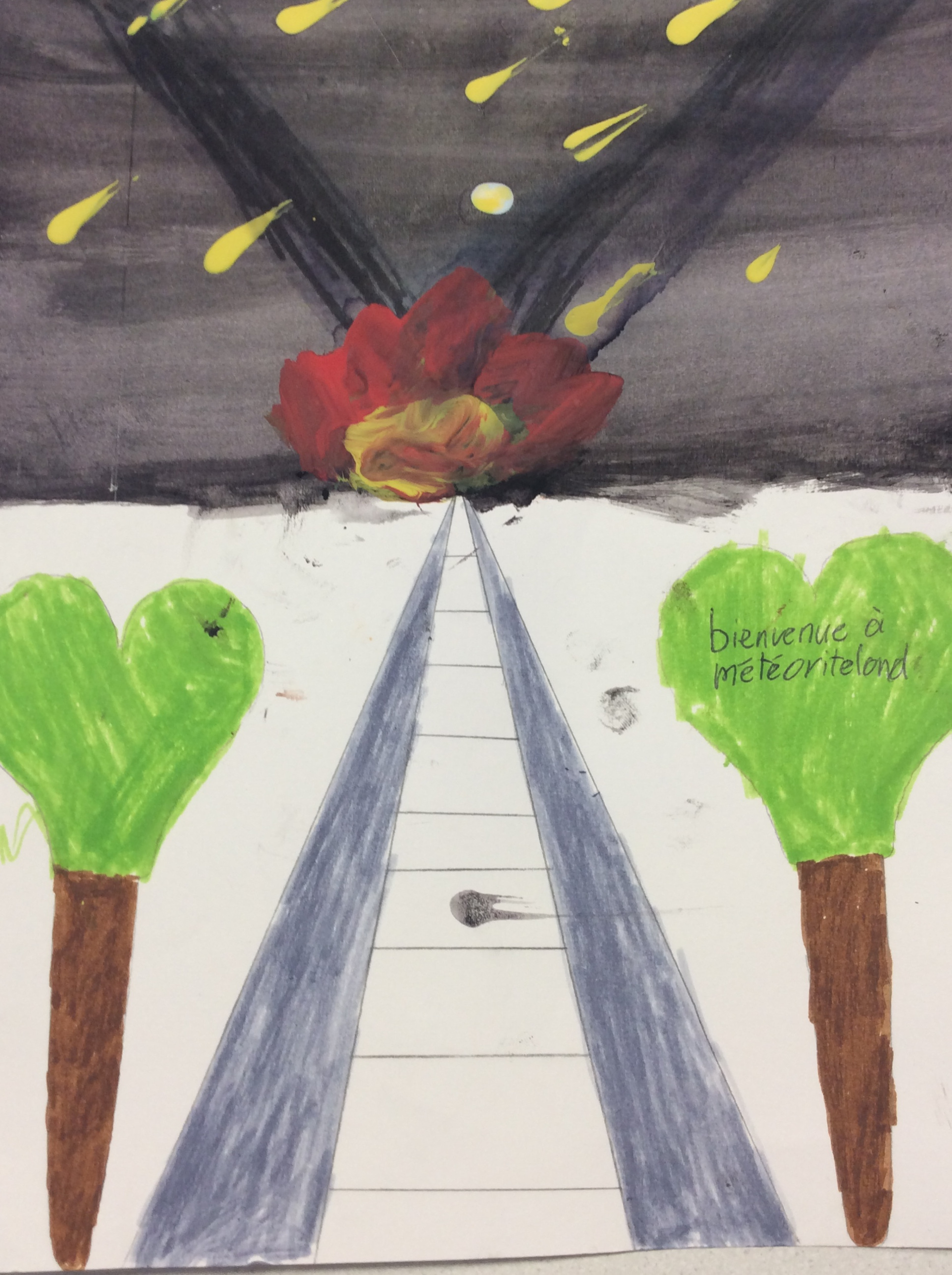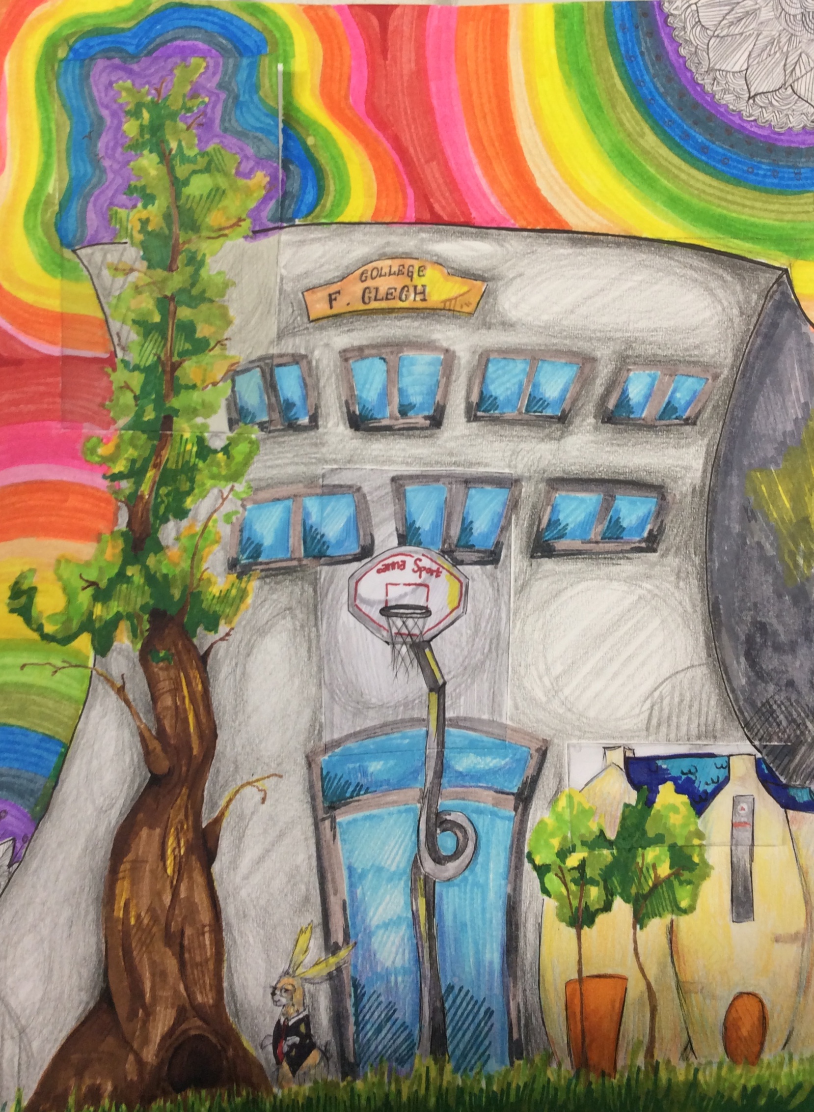 Après un travail de croquis de lignes dans la salle d’arts plastiques, les élèves devaient réaliser une production en s’inspirant de leurs croquis et invitant le spectateur à se promener.