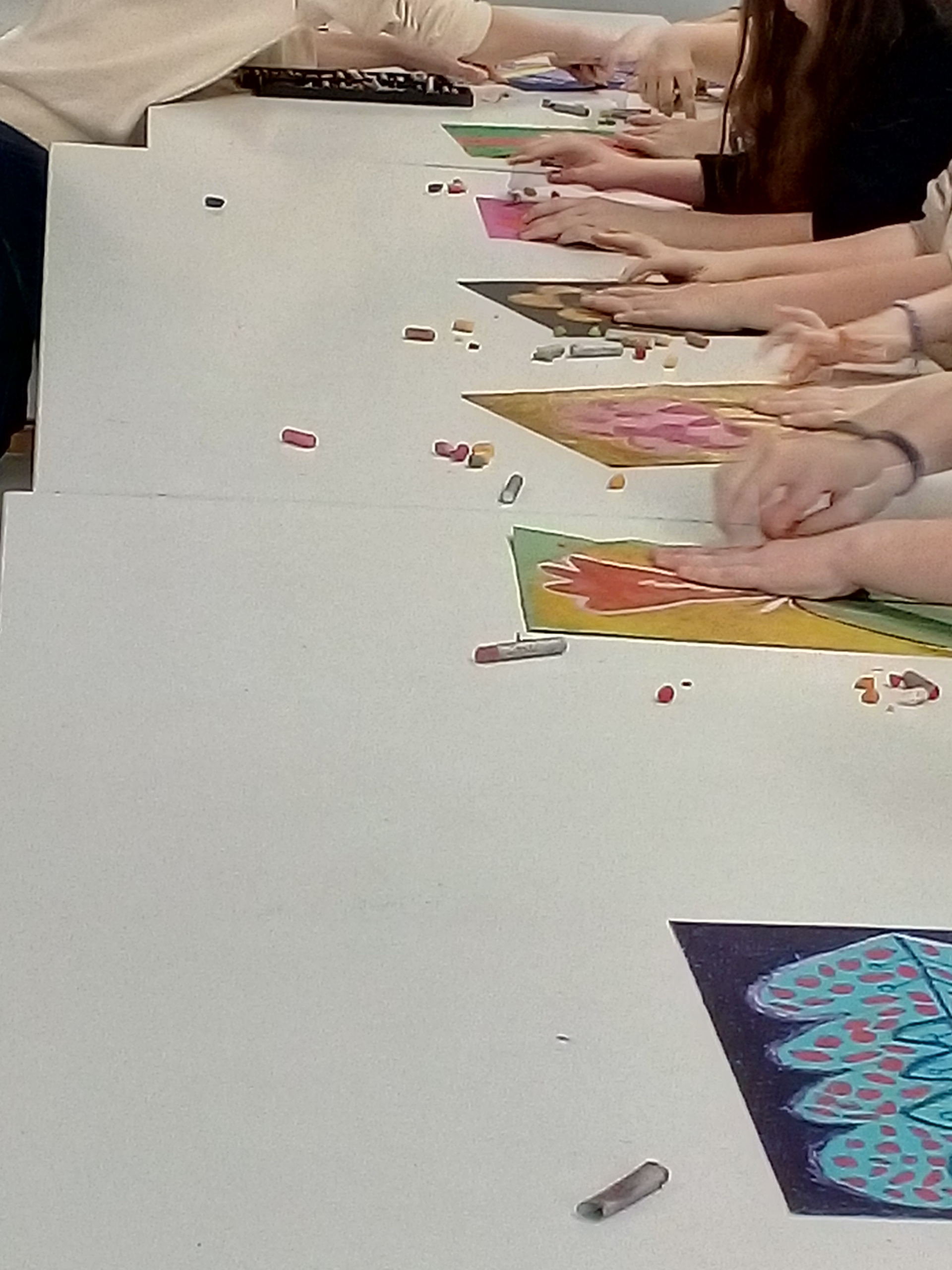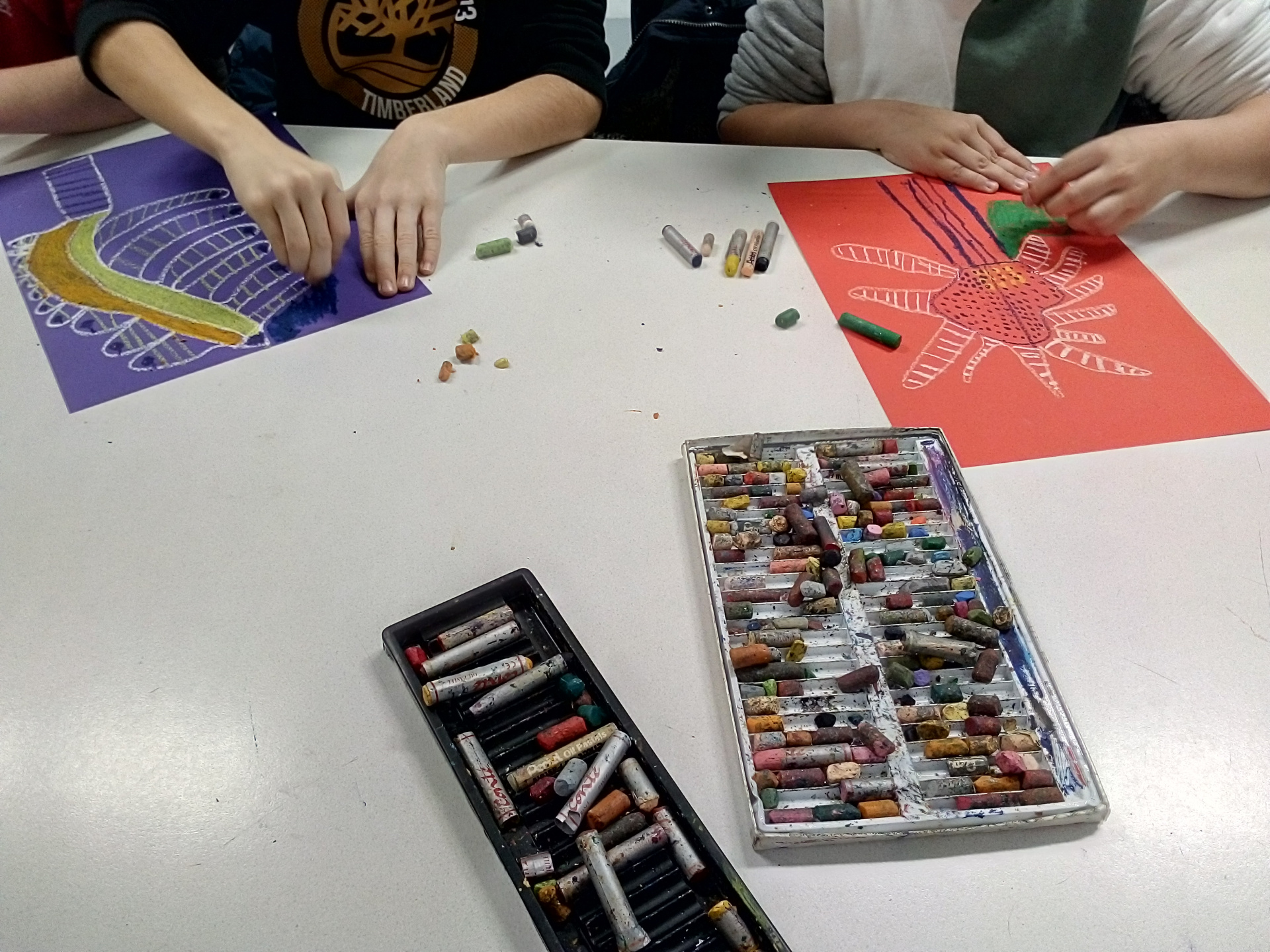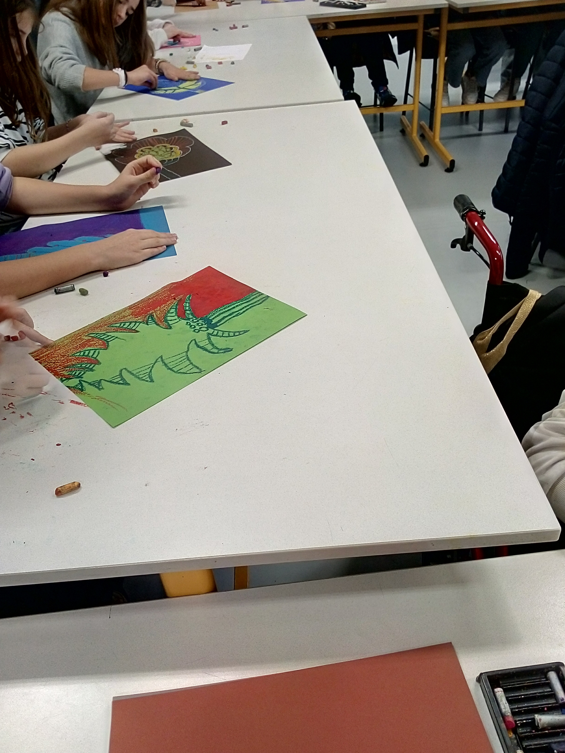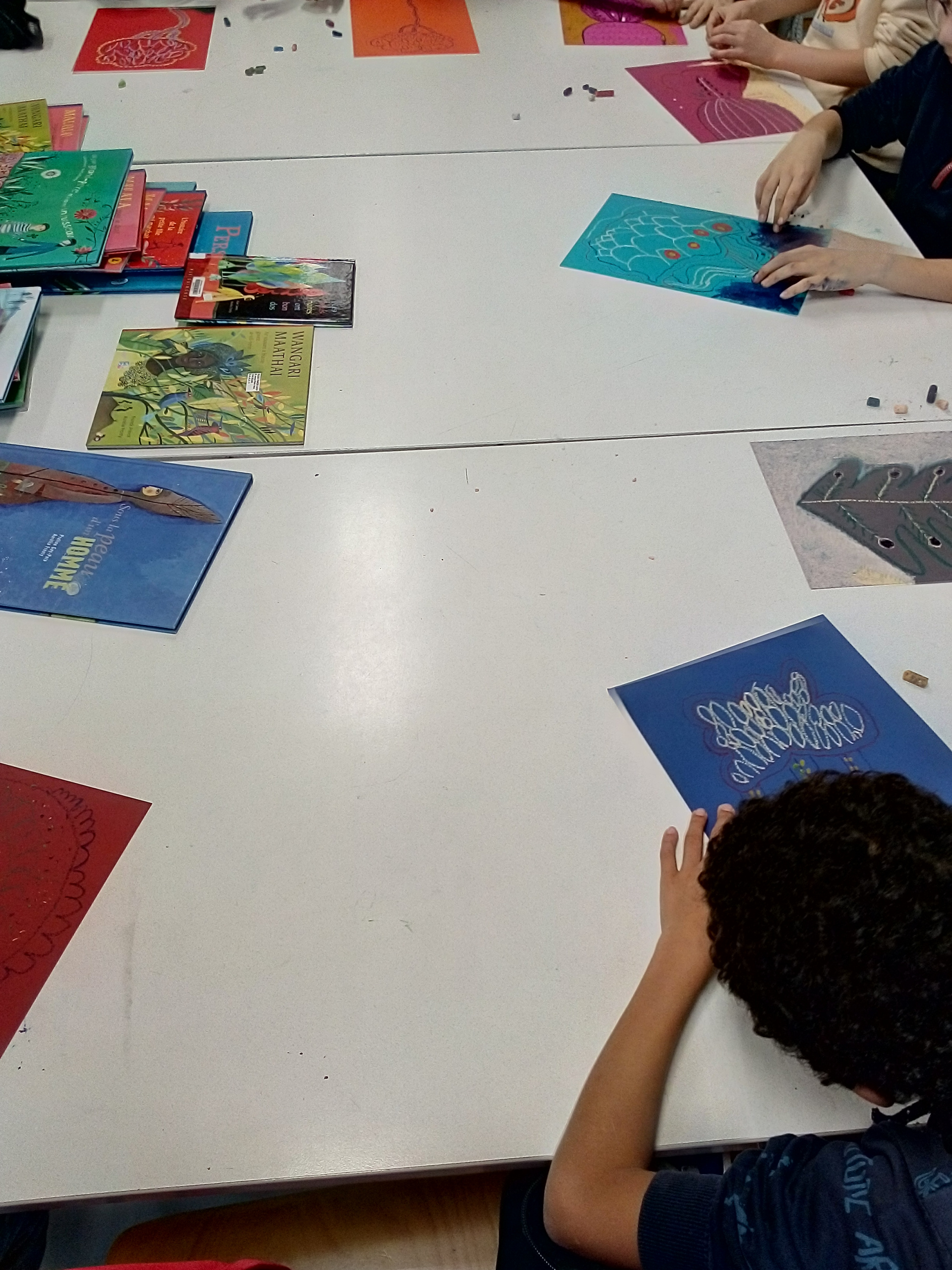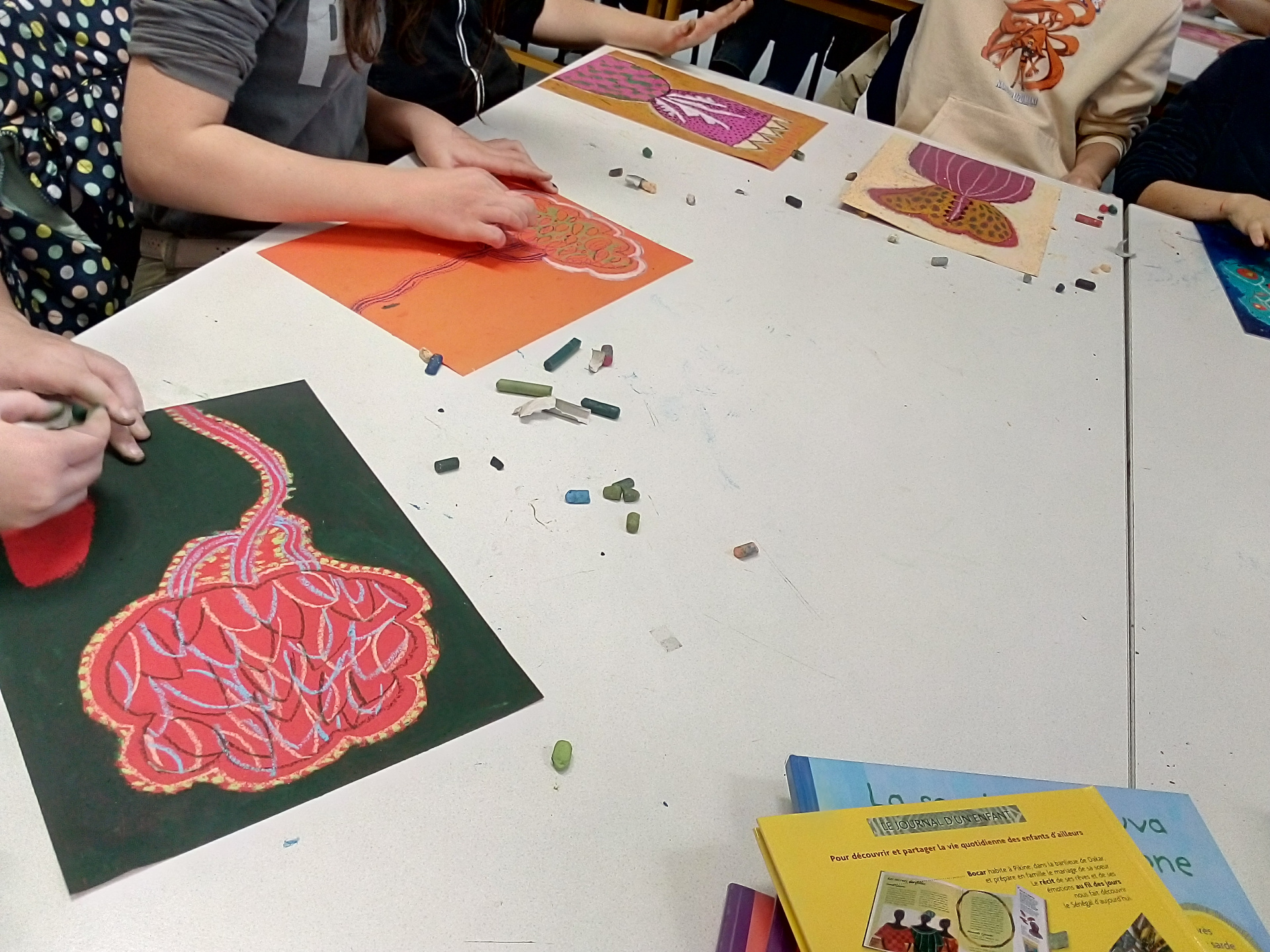 Cette rencontre a eu lieu grâce au partenariat avec la médiathèque de Bégard, qui accueillait l’artiste, Aurélia Fronty a d’abord répondu aux questions des élèves, puis elle a créé une œuvre originale juste pour la classe. Ensuite elle a dessiné 8 modèles d’arbres et chaque élève a dû choisir et en reproduire un sur une feuille de couleur, puis remplir tout l’espace du dessin à l’aide 3 pastels de couleurs différentes. Ce travail sur le motif et la couleur a été très enrichissant et motivant pour les élèves.