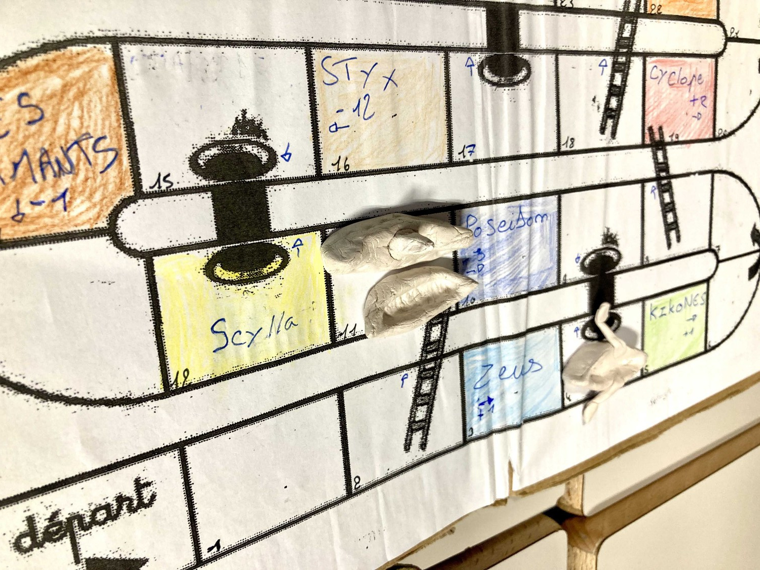 La lecture de l’Odyssée et plus particulièrement la découverte des monstres rencontrés par Ulysse au cours de son épopée ont permis aux élèves de revisiter le traditionnel jeu de l’oie pour le transformer en « Jeu de l’Odyssée », « Voyage d’Ulysse »…