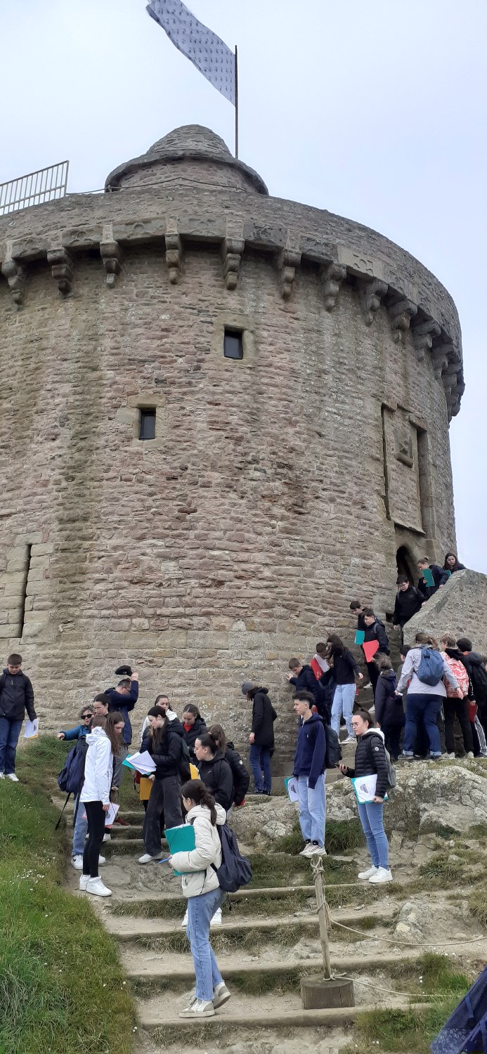Le 19 avril, par une belle mais froide journée, tous les élèves de 5e du collège ont pris le car pour se rendre sur le site historique du château de la Roche-Goyon, plus connu sous le nom de Fort La Latte. Cette sortie est venue conclure une longue période de cours en français et en histoire sur le Moyen-Age. Grâce au travail préparatoire de leurs professeures d’histoire, ils ont pu faire une visite du site avec une activité à réaliser sur chaque endroit stratégique du château. Ils ont notamment pu profiter de la visite du donjon et de la vue incroyable sur la côte qu’offre le sommet. Après un pique-nique copieux, ils ont marché entre le château et le cap Fréhel, admirant au passage les différentes vues sur la mer et affrontant le vent frais. Curieusement, le retour fut plus silencieux que l’année, signe que tout le monde avait passé une bonne journée !