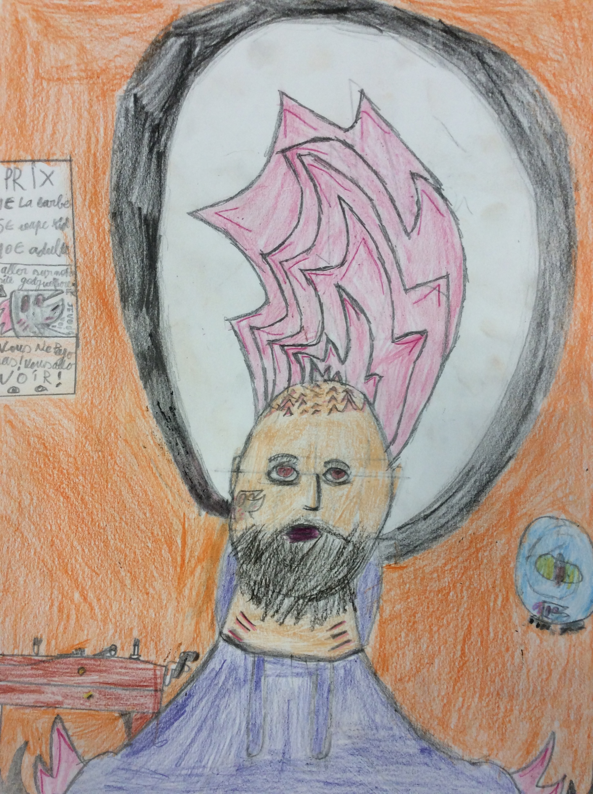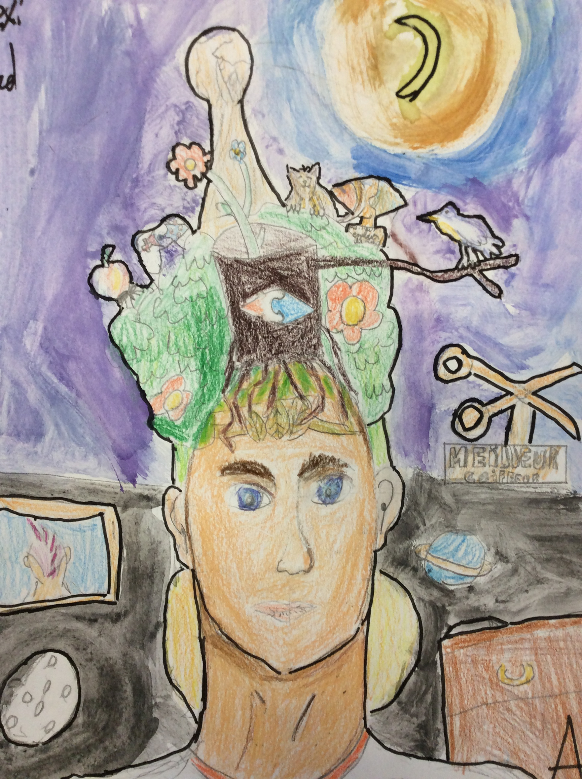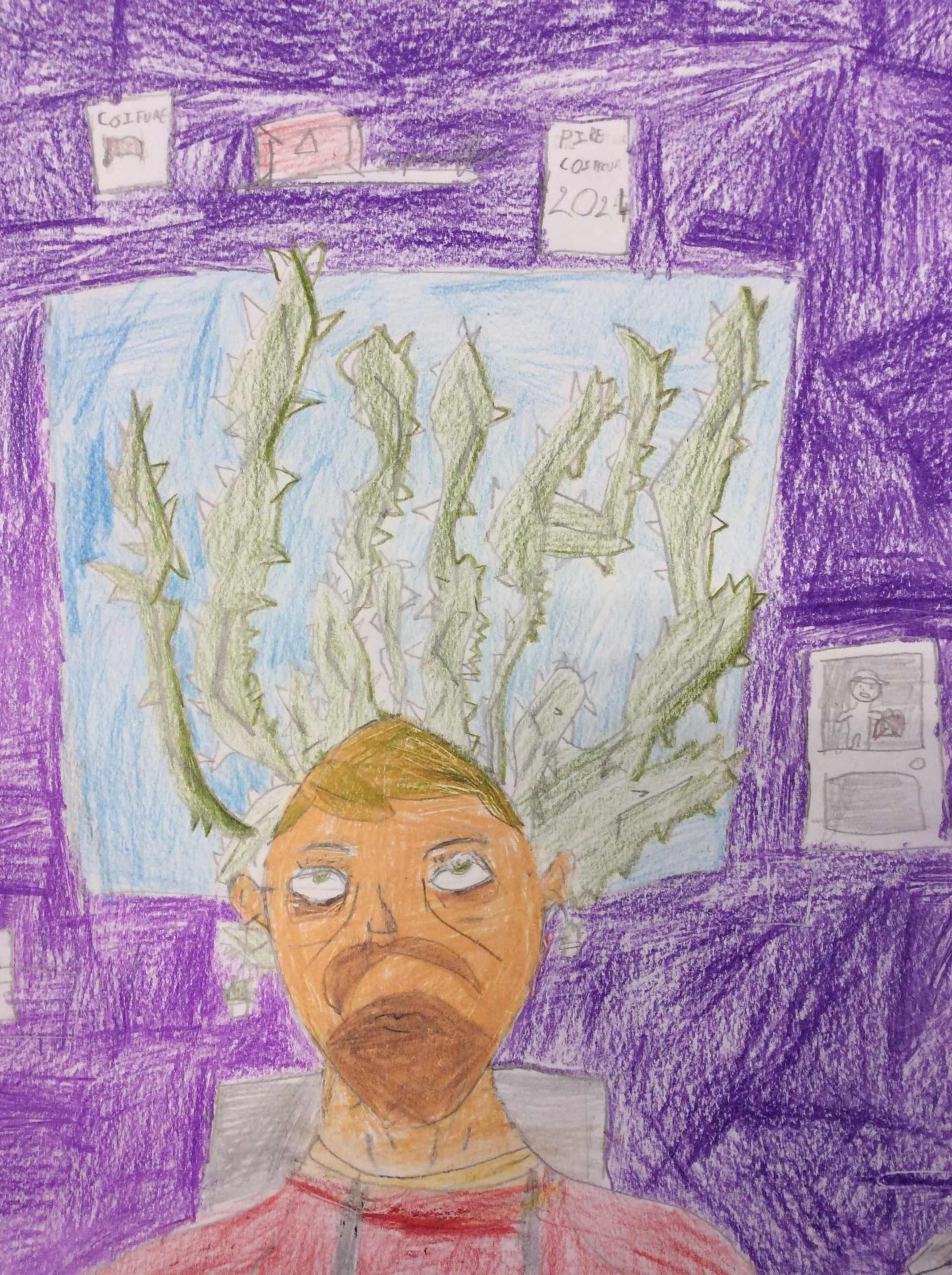 Les élèves de 6e sont heureux de vous présenter leurs productions. Ils ont dû représenter leur client, imaginer une coiffure complétement folle sans cheveu puis réaliser un fond qui fasse ressortir leur client et sa coiffure.