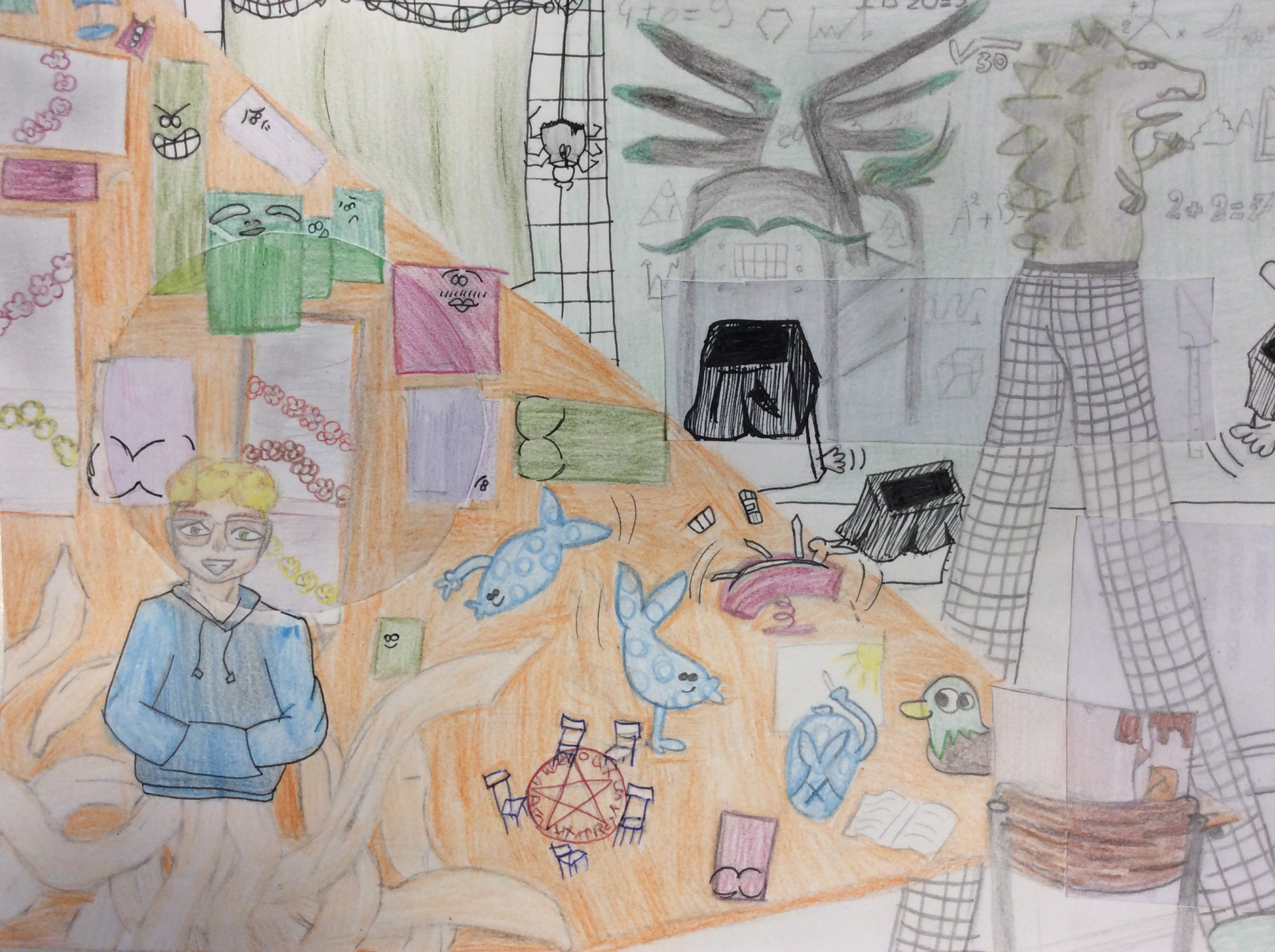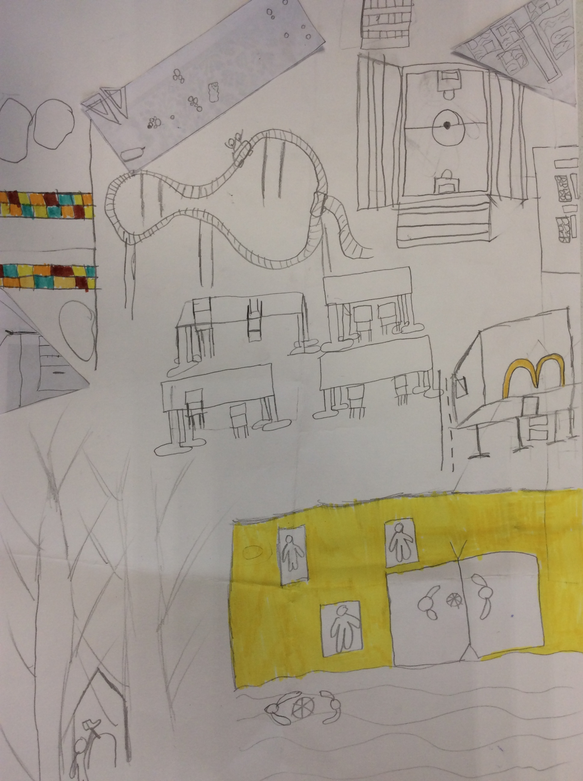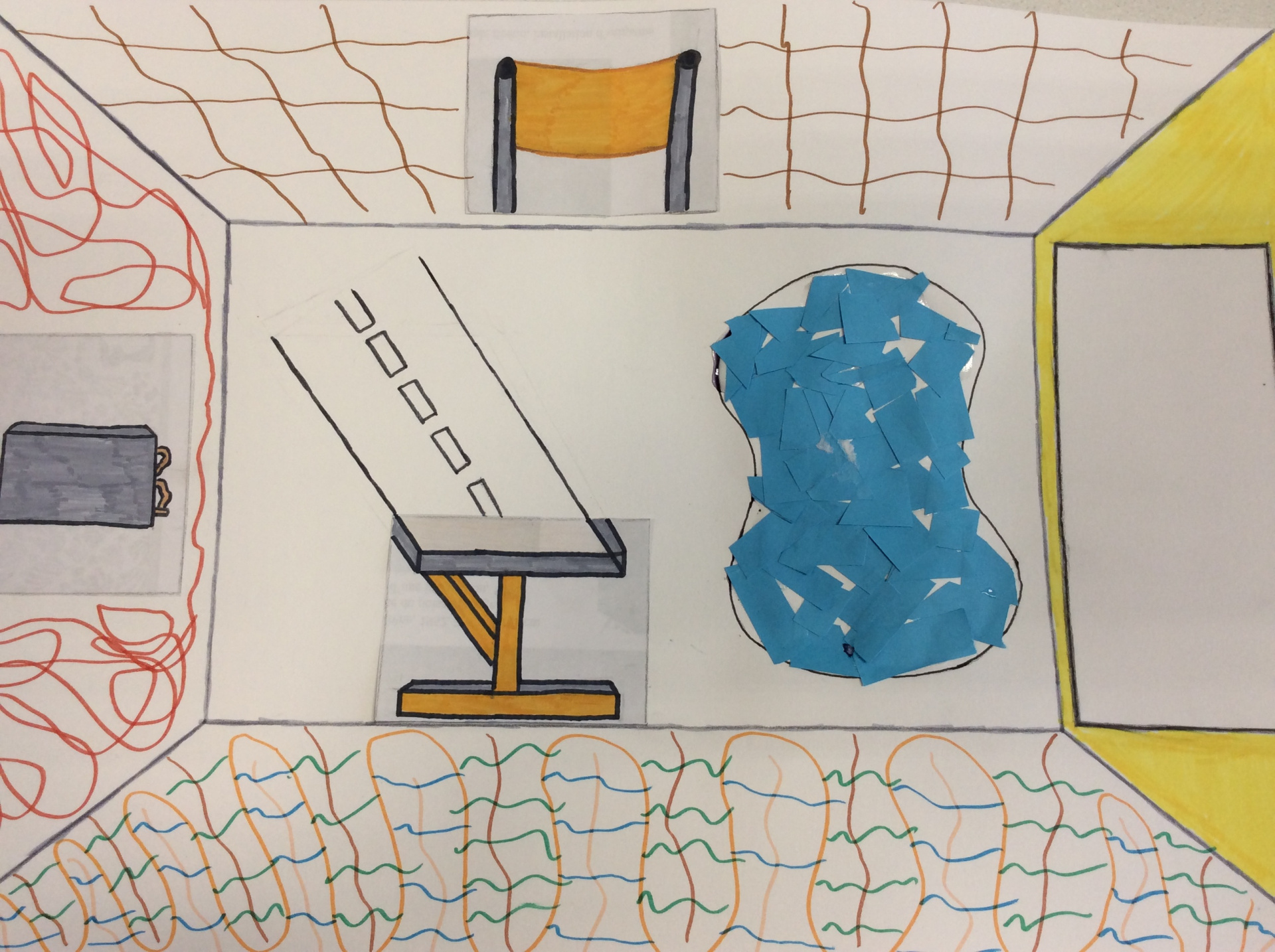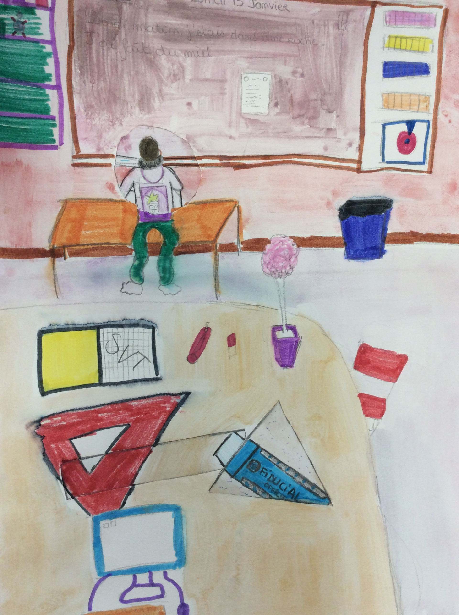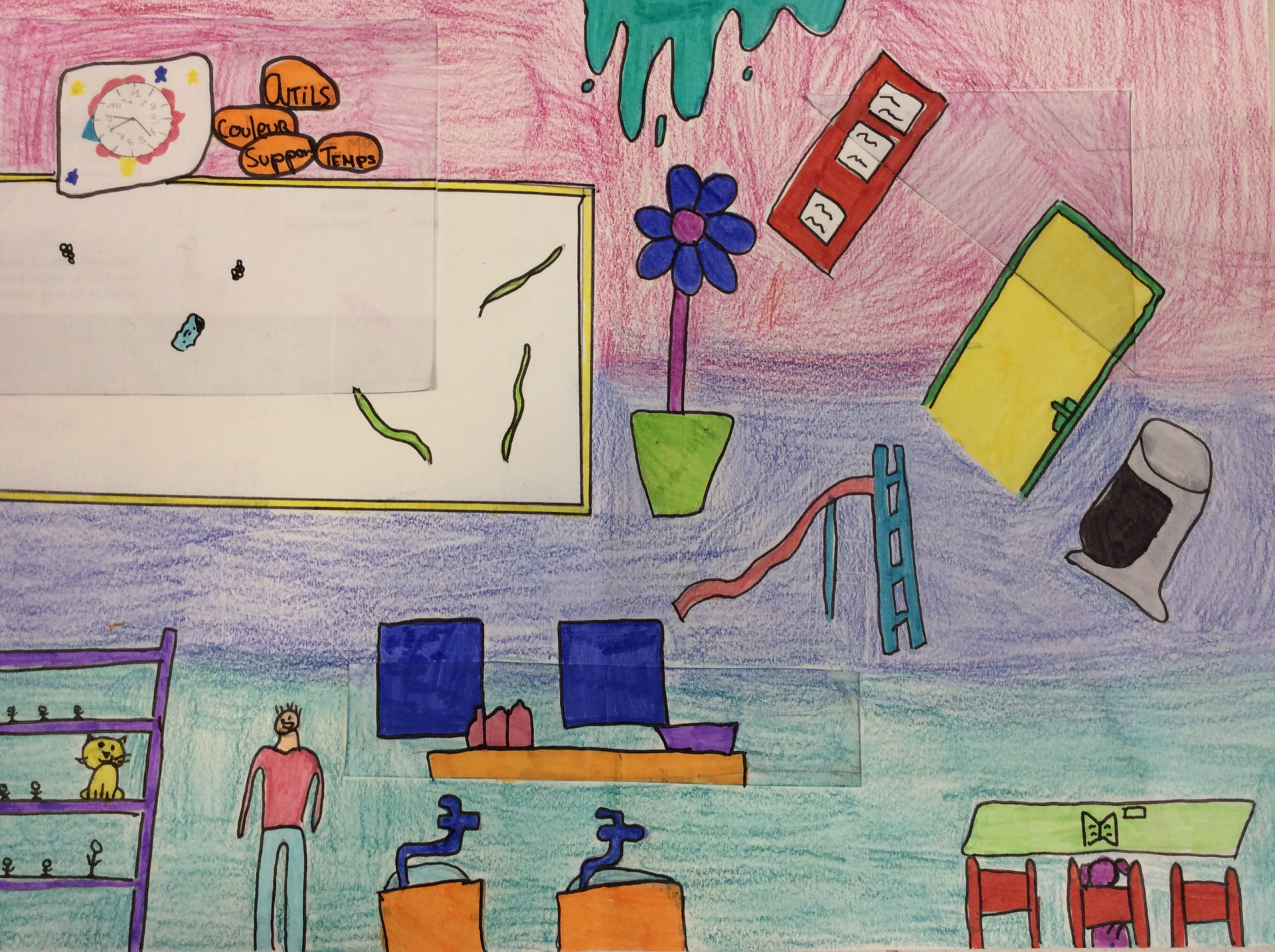 Les élèves de 4e ont réalisé plusieurs croquis de la classe d’arts plastiques , cherchant différents cadrages et points de vue. A partir de ces croquis ils ont créé une classe complétement loufoque, en utilisant la couleur pour faire comprendre leurs idées.