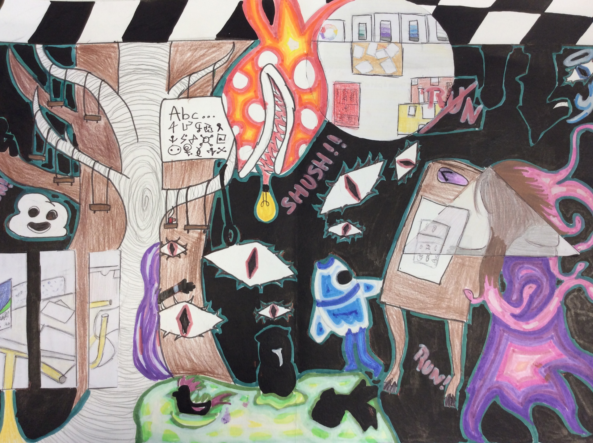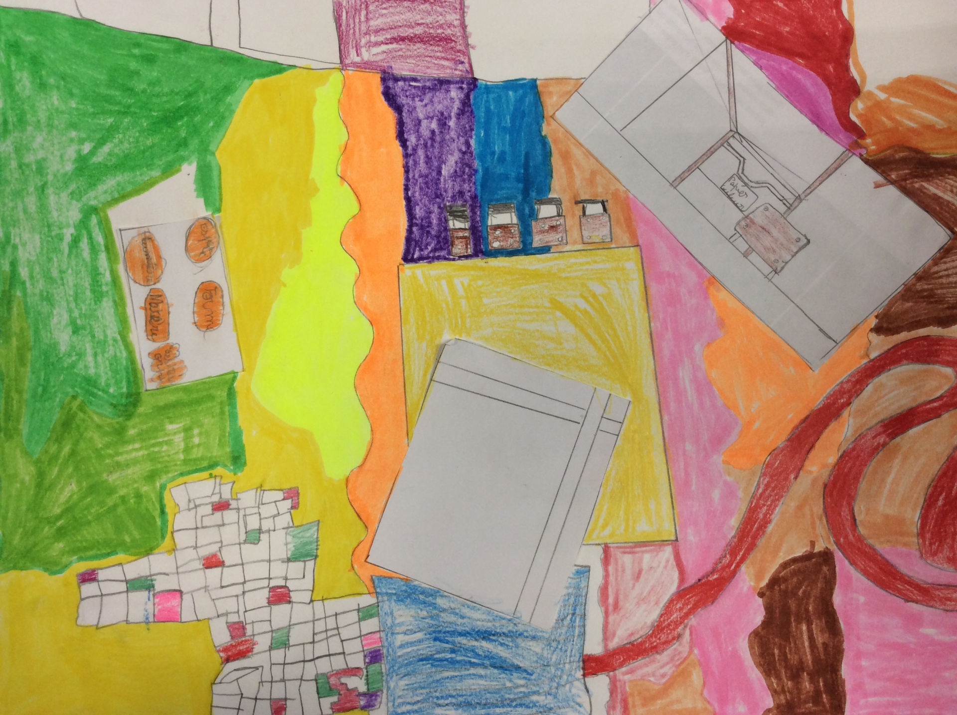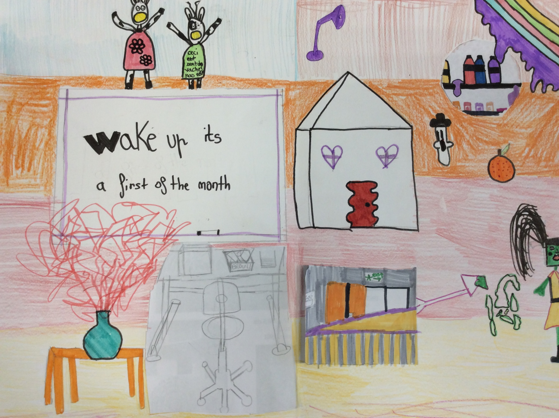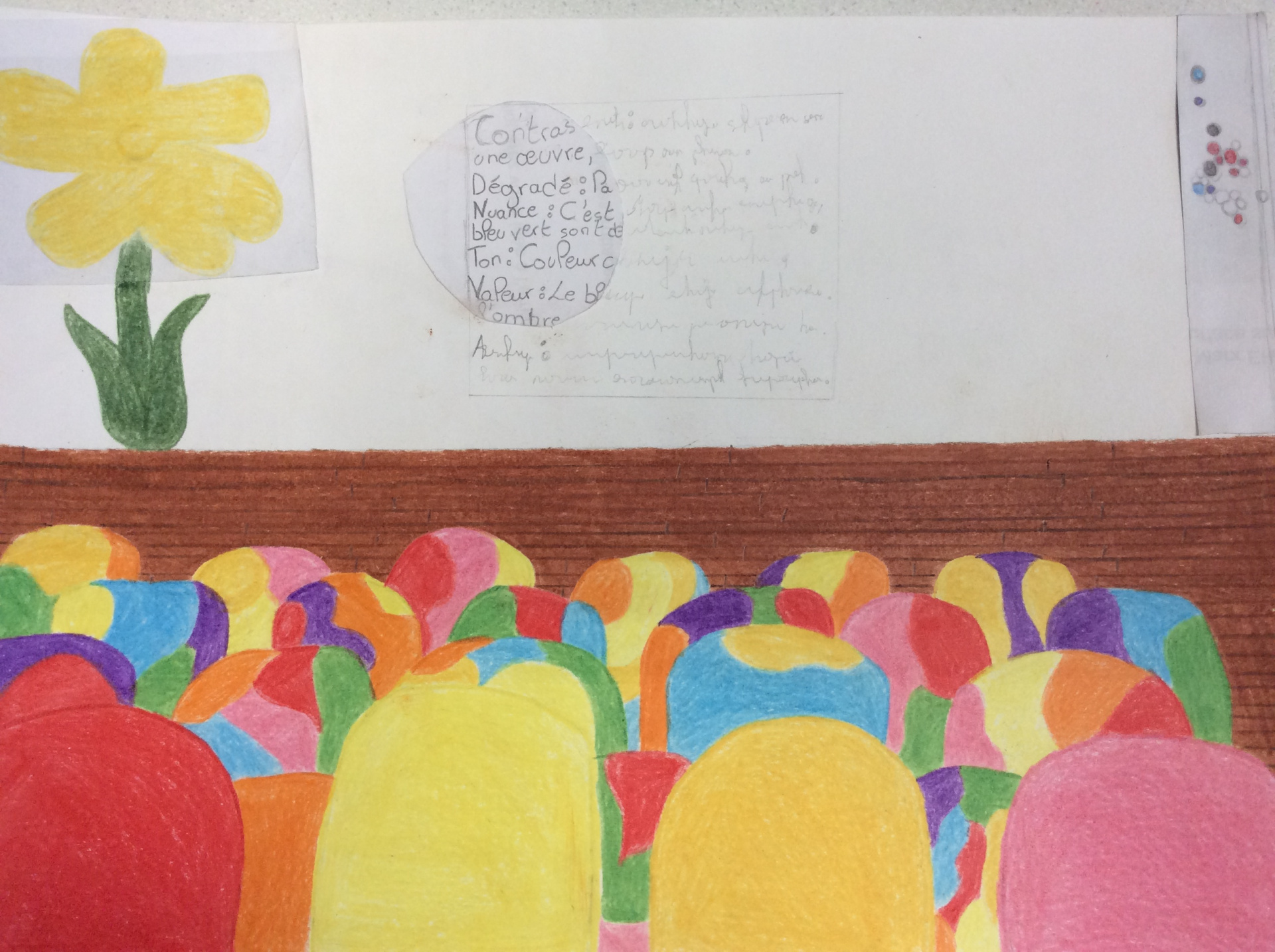 Les élèves de 4e ont réalisé plusieurs croquis de la classe d’arts plastiques , cherchant différents cadrages et points de vue. A partir de ces croquis ils ont créé une classe complétement loufoque, en utilisant la couleur pour faire comprendre leurs idées.