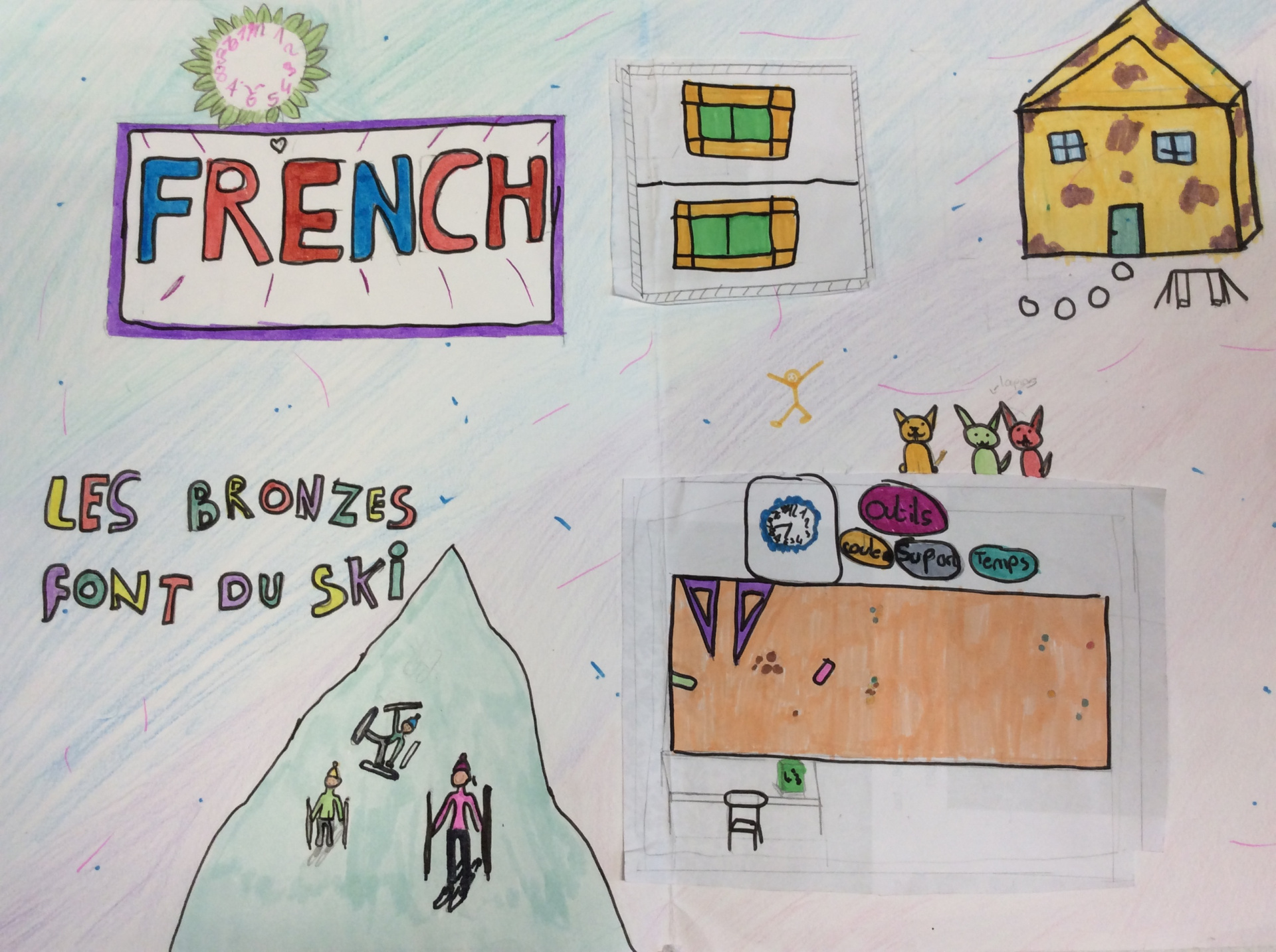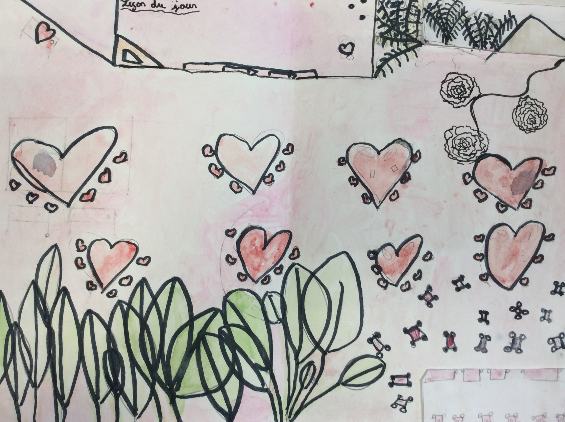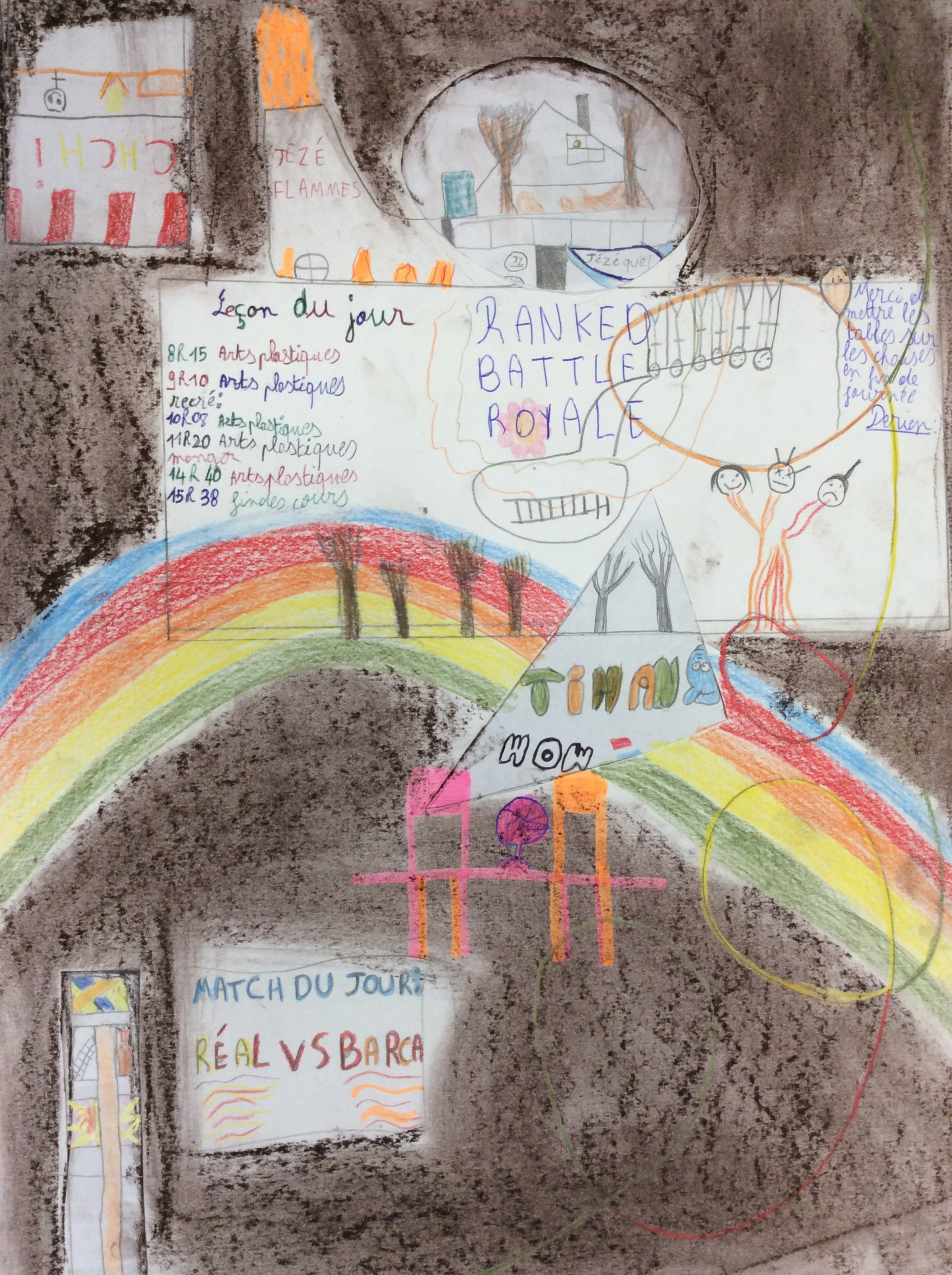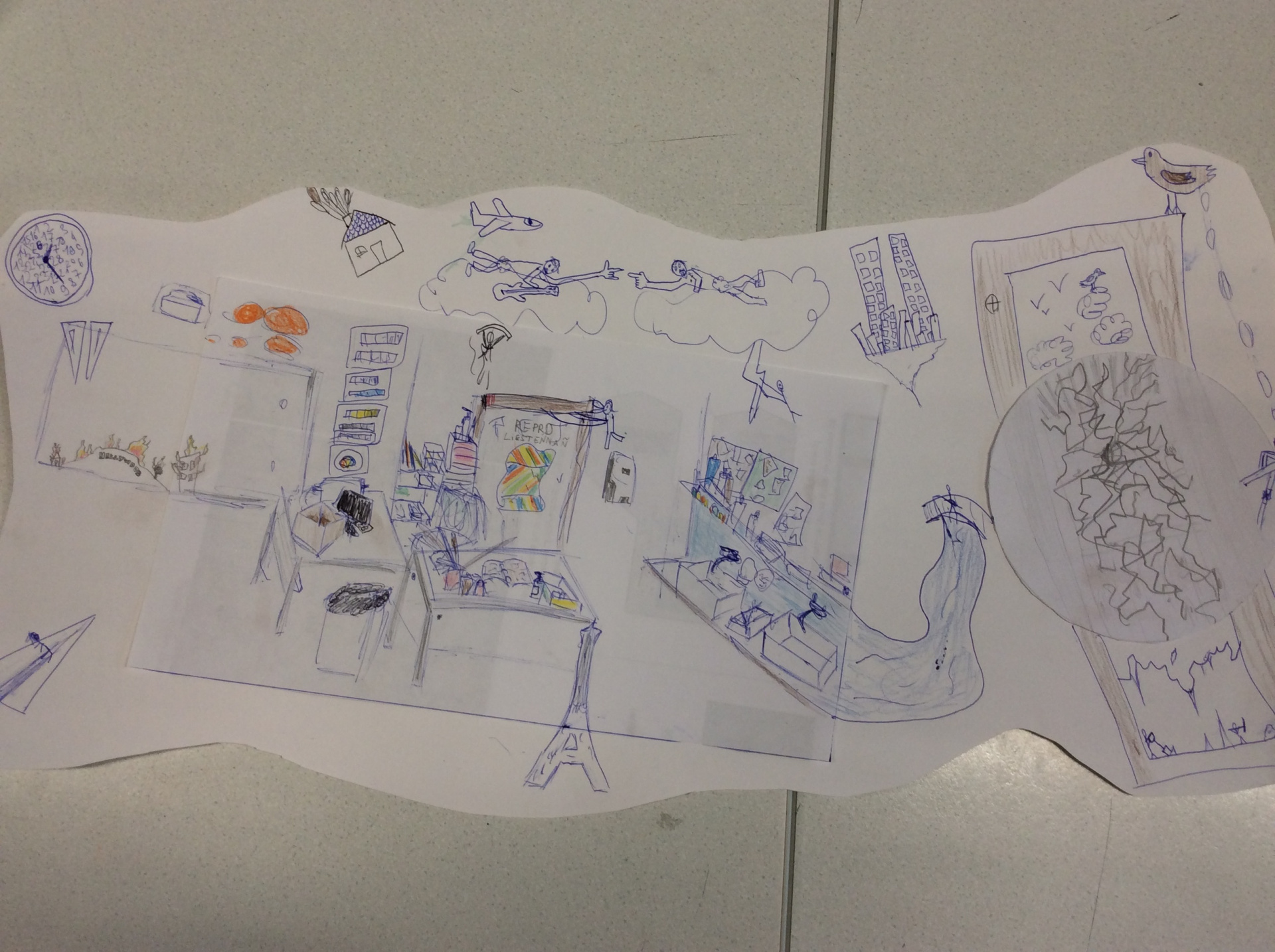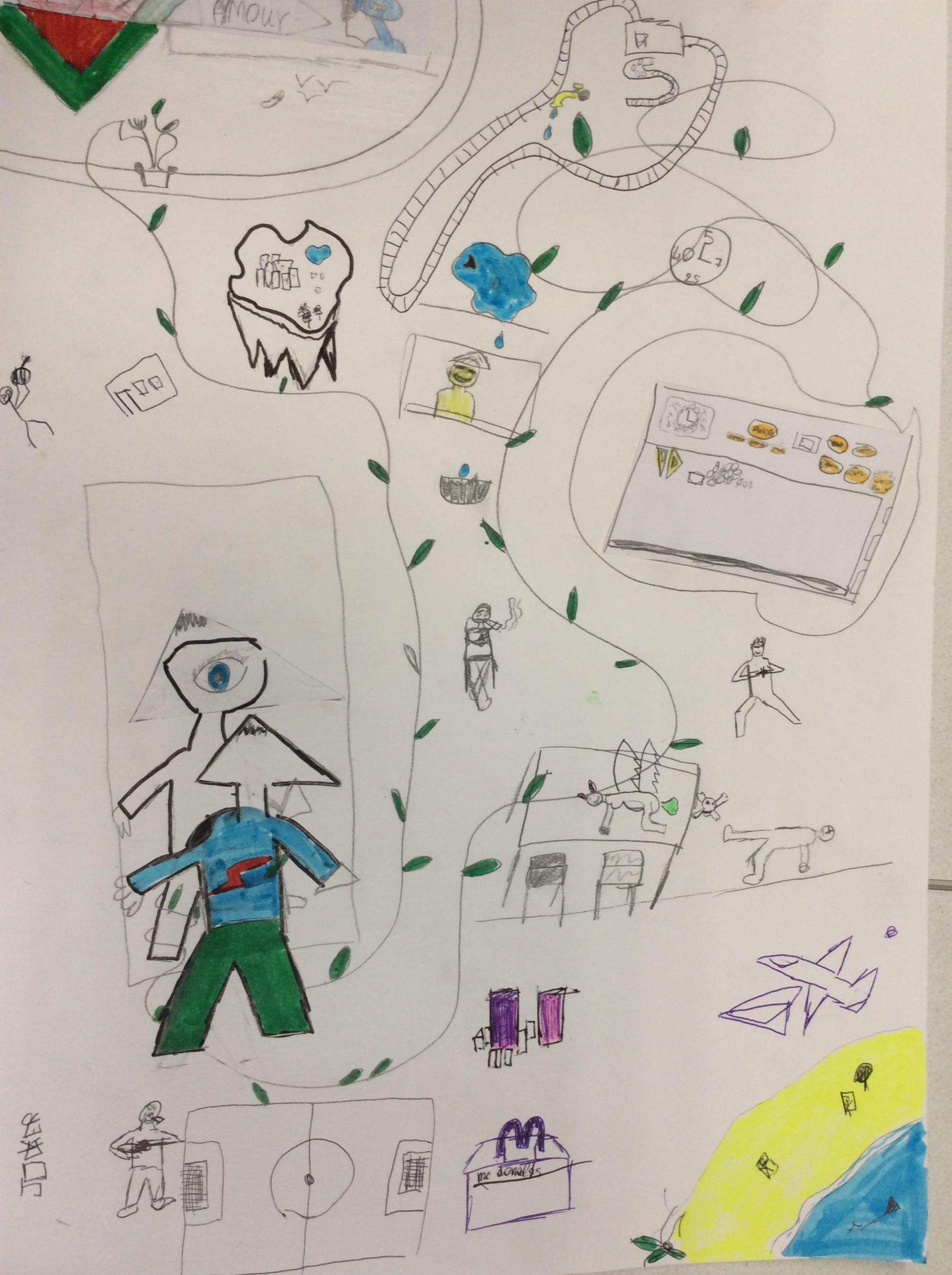 Les élèves de 4e ont réalisé plusieurs croquis de la classe d’arts plastiques , cherchant différents cadrages et points de vue. A partir de ces croquis ils ont créé une classe complétement loufoque, en utilisant la couleur pour faire comprendre leurs idées.