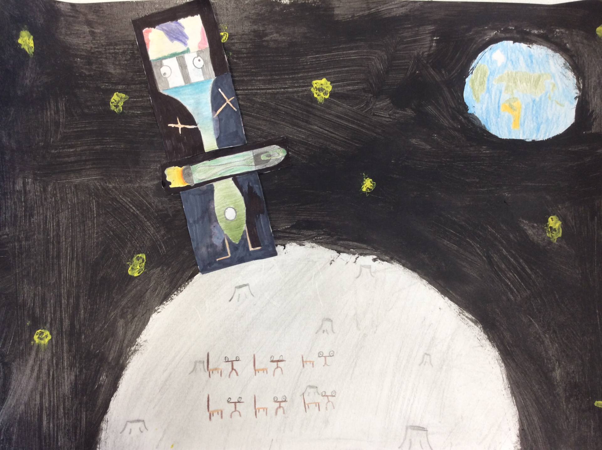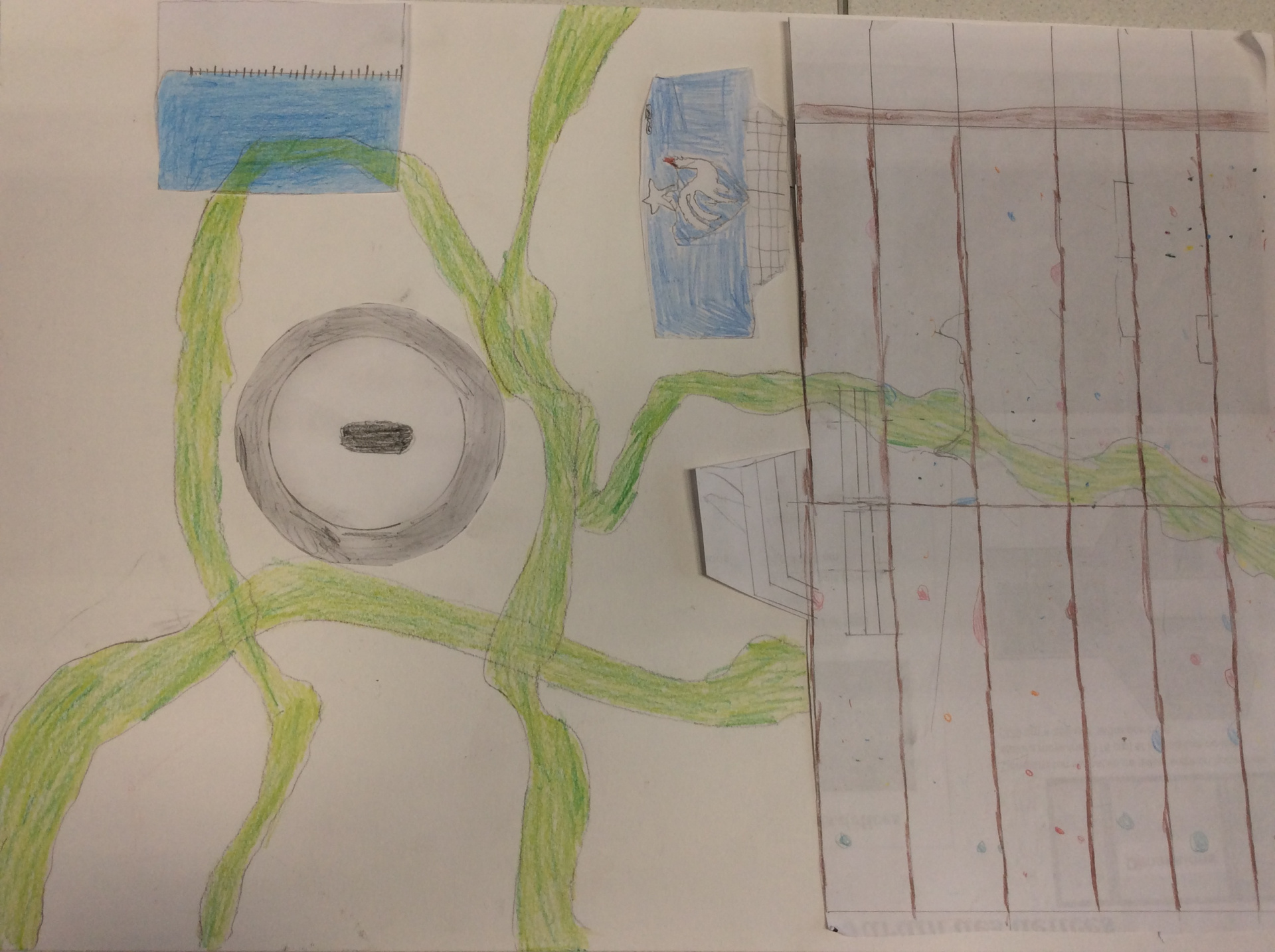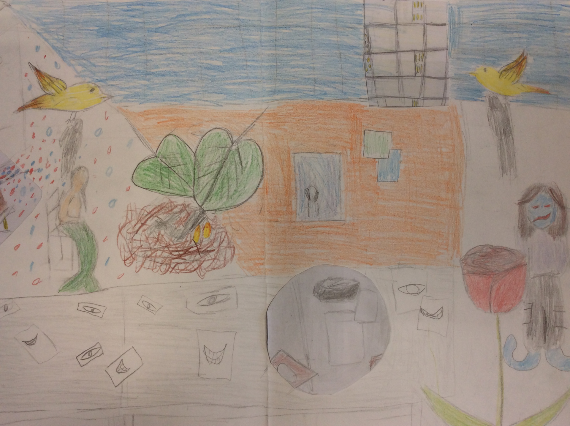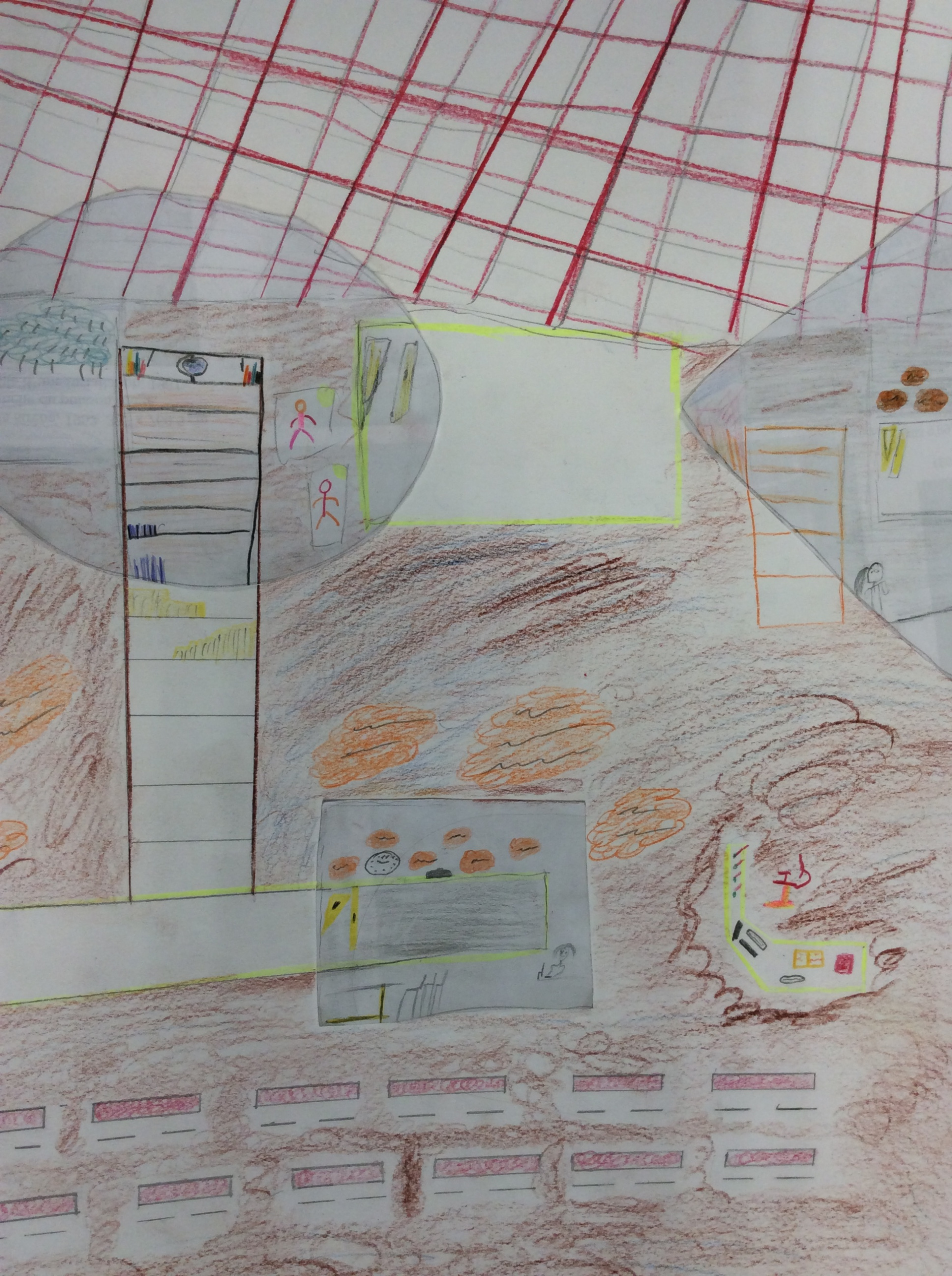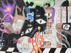 Les élèves de 4e ont réalisé plusieurs croquis de la classe d’arts plastiques , cherchant différents cadrages et points de vue. A partir de ces croquis ils ont créé une classe complétement loufoque, en utilisant la couleur pour faire comprendre leurs idées.
