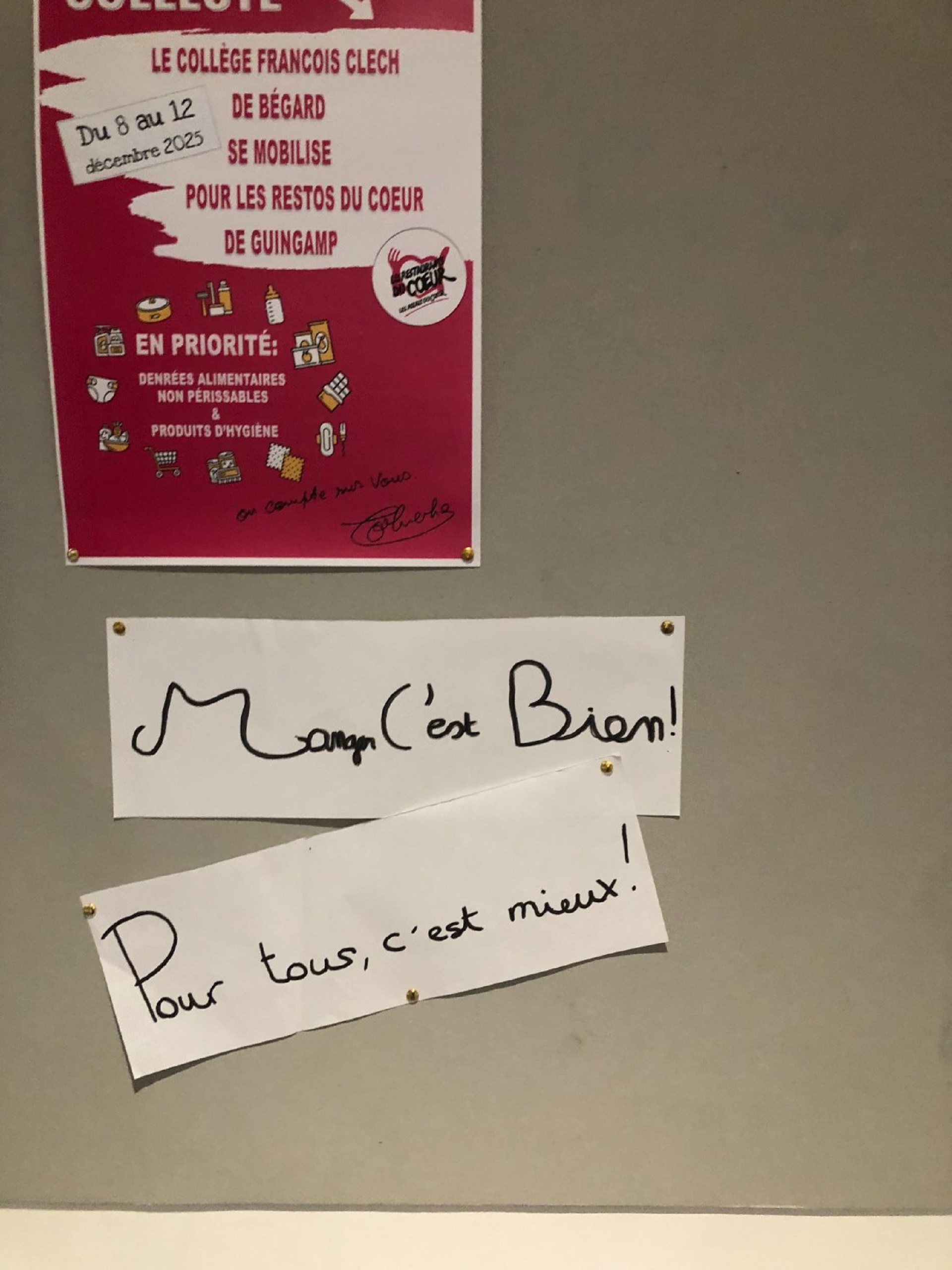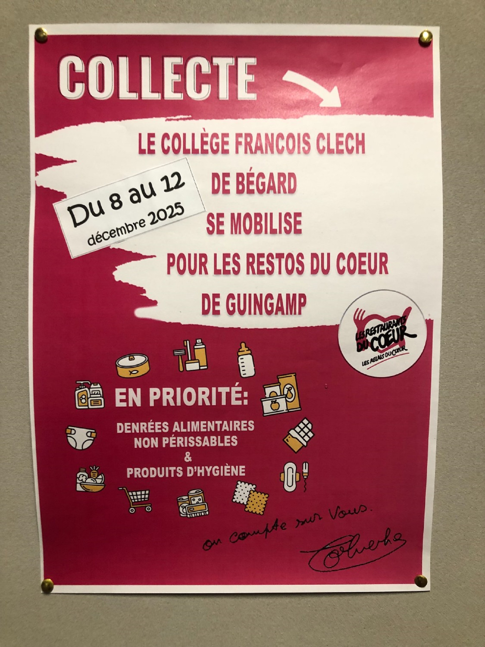 Du 8 au 12 décembre 2025, le collège François Clech de Bégard organise une grande action de sensibilisation au profit des Restos du Coeur de Guingamp.
